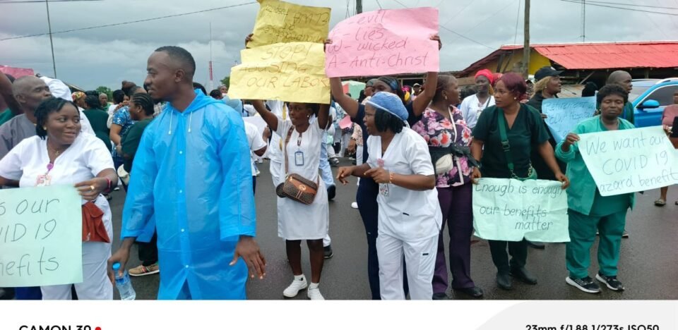PYNESVILLE CITY – In a bold display of frustration, nurses and doctors at the ELWA Hospital in Paynesville City on Monday staged a peaceful protest to demand fair compensation and improved working conditions, citing a widening gap between the high cost of healthcare services and their meager earnings.
