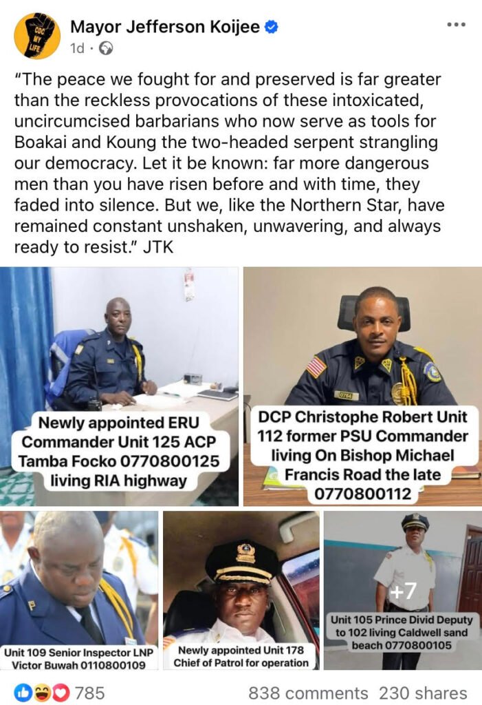 Among those accused of sharing senior officers’ contact information is Jefferson Koijee, the immediate past Mayor of Monrovia.