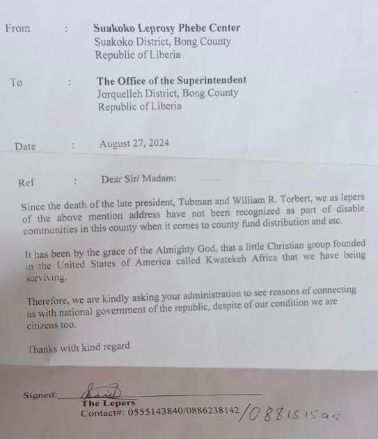 The lepers, on August 27, 2024 wrote a communication to Bong County Superintendent, Madam Loleyah Hawa Norris, urging her leadership to connect the colony with the central government for budgetary allotment and aid. In their communication, a copy of which is in this payer’s possession, the lepers decried their exclusion from people with disability since the demise of president.